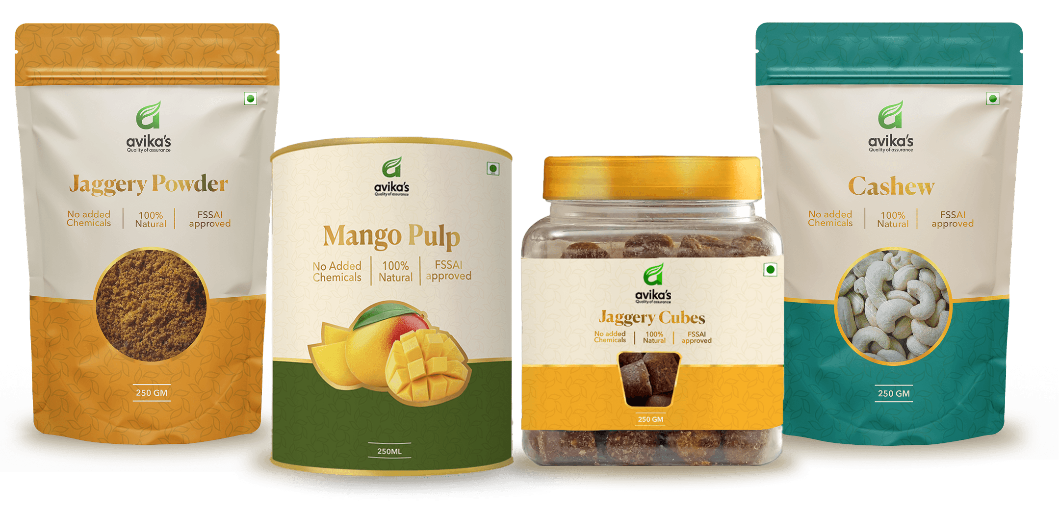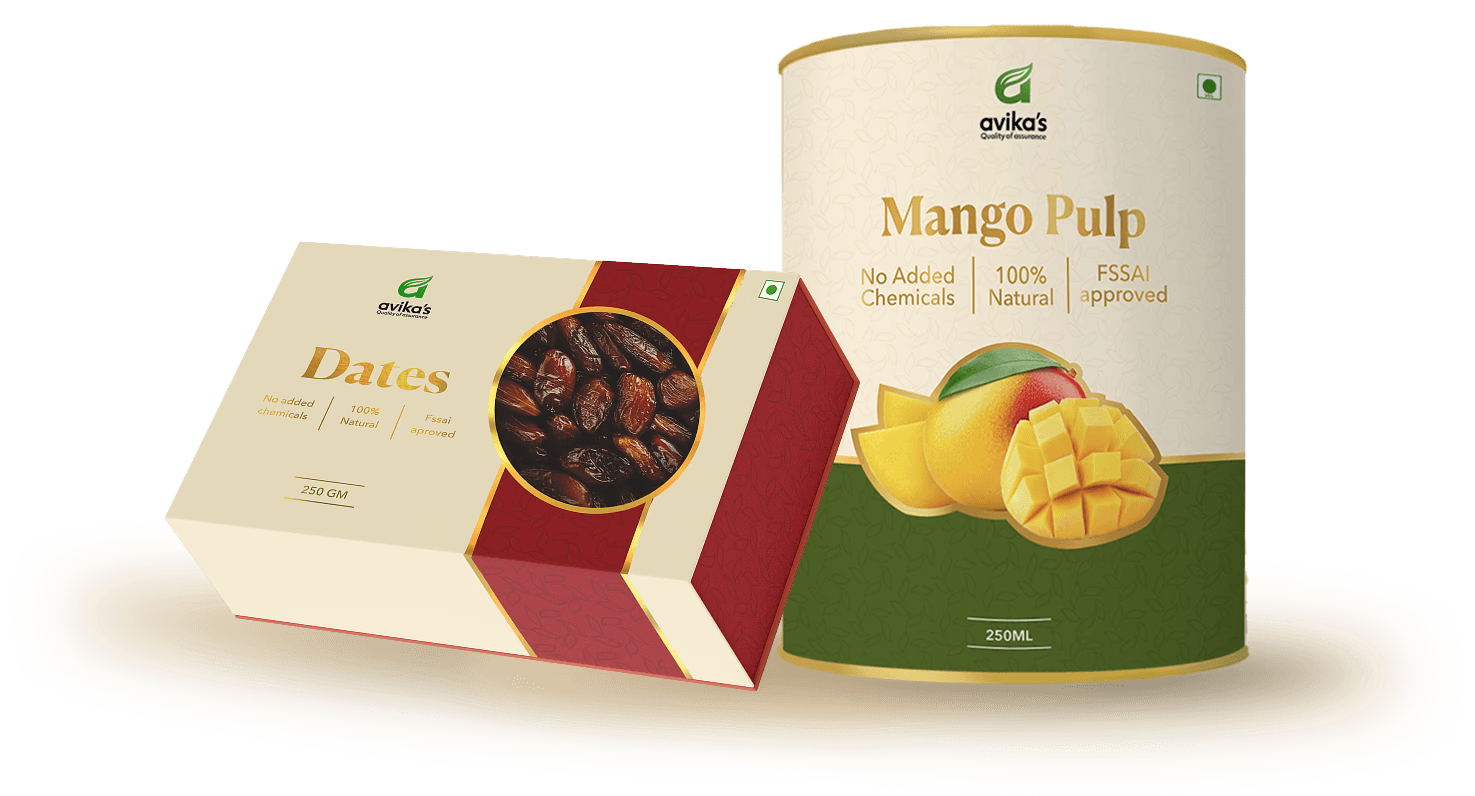 Maroon for dates evokes richness and complements their natural hue, while sap green for mango pulp conveys freshness and purity.