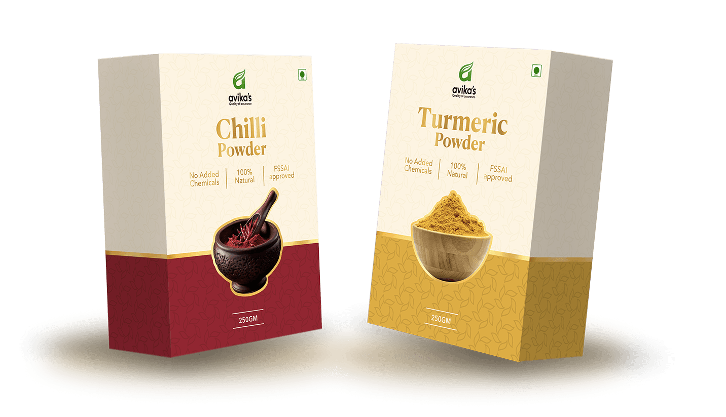 Dark red is for chilli as it evokes boldness of spice, while mustard yellow for turmeric mirrors its vibrant, natural appeal.