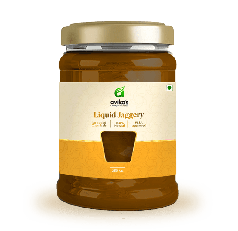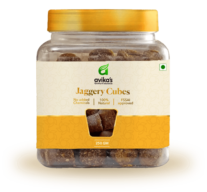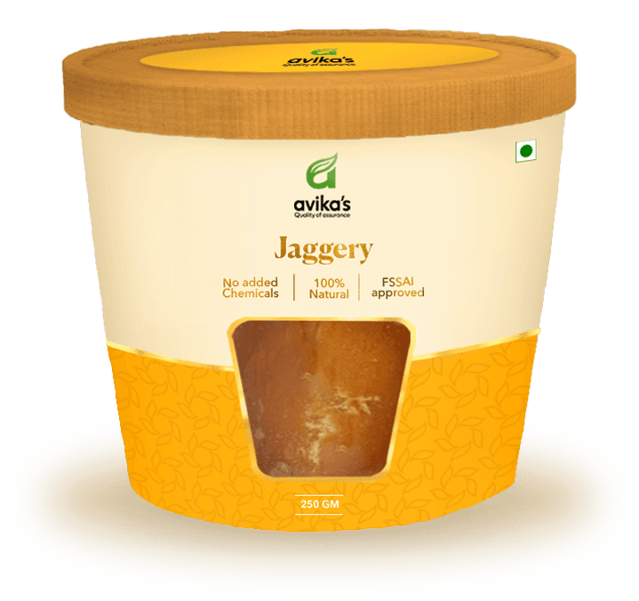 Golden yellow creates vibrant contrast with deep brown of jaggery adding richness.