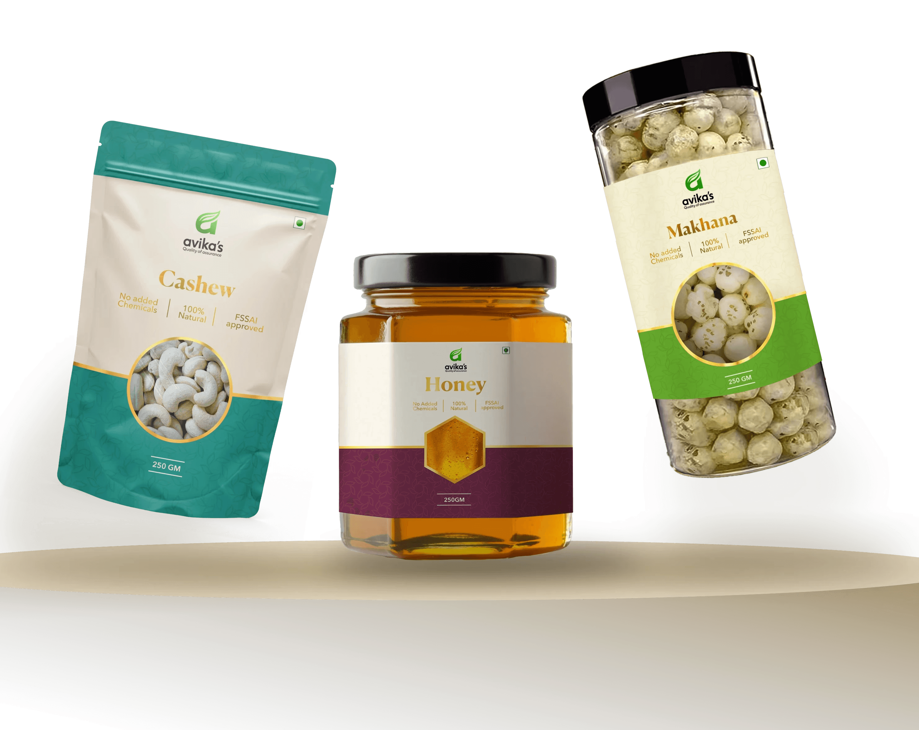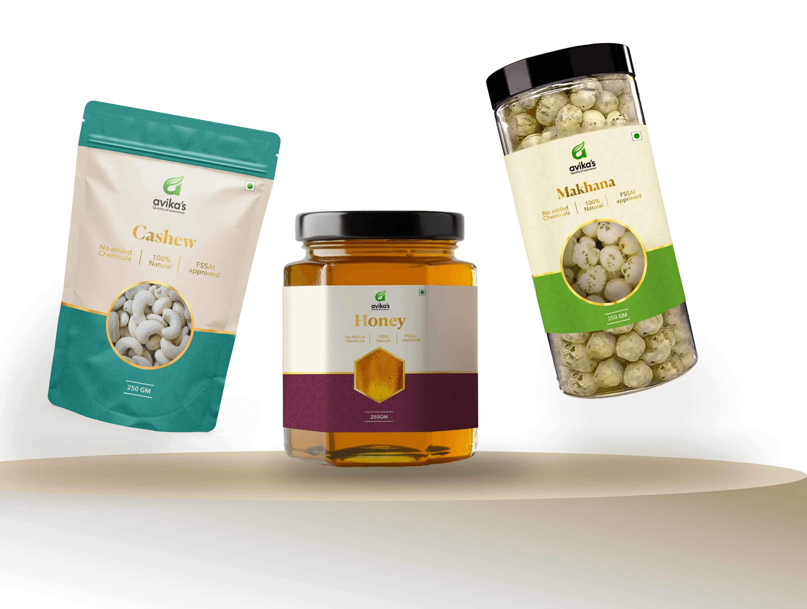 The typography blends modernity with a touch of tradition, reflecting Avika’s grounded yet contemporary identity. The color palette pairs fresh greens with earthy tones to convey purity, nature, and trust across its diverse product range.