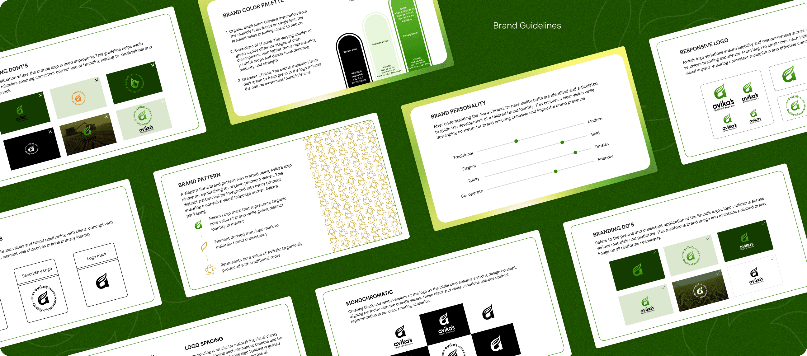 A comprehensive brand guideline was developed to ensure consistency across all touchpoints. It defines logo usage, colors, typography and visual elements to maintain Avika’s organic and cohesive identity.