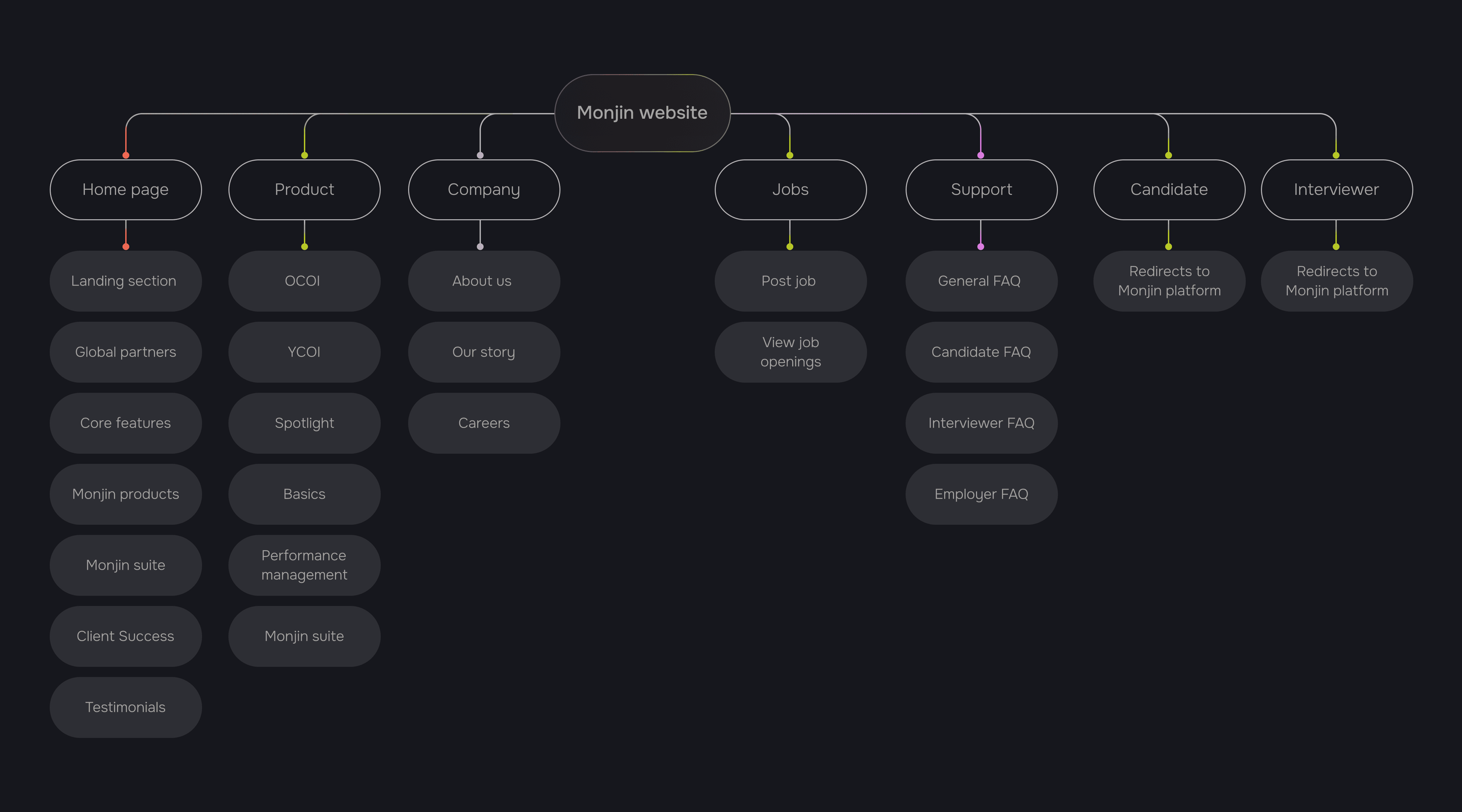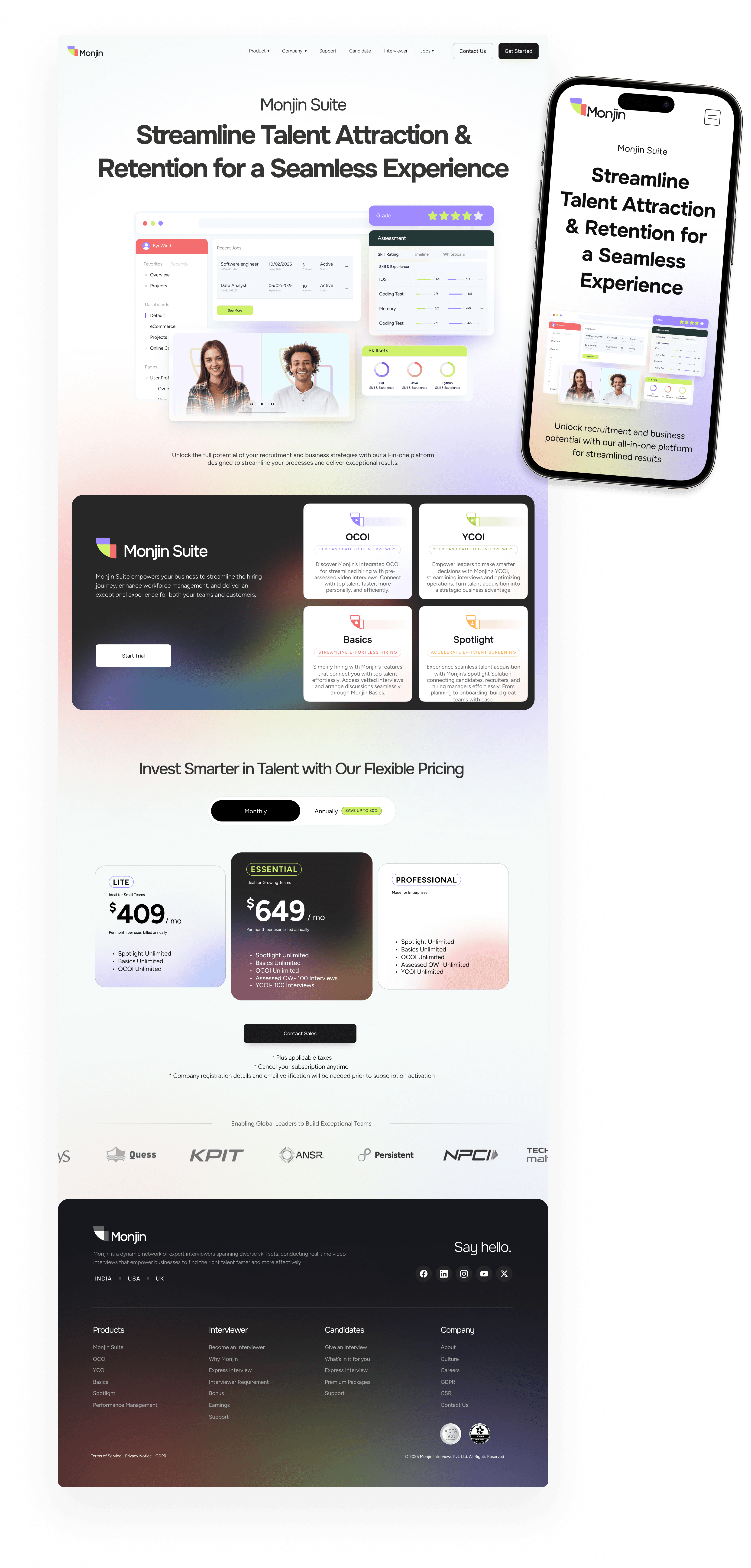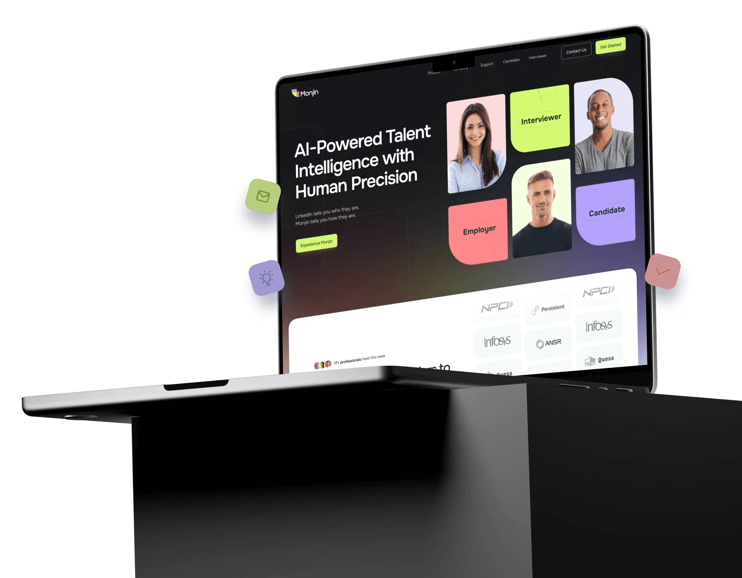 The typography is clean, crisp, and minimal to reflect Monjin’s modern identity. The color palette is diverse to mirror the range of products, with three primary colors representing the brand’s key audiences employers, interviewers and candidates.