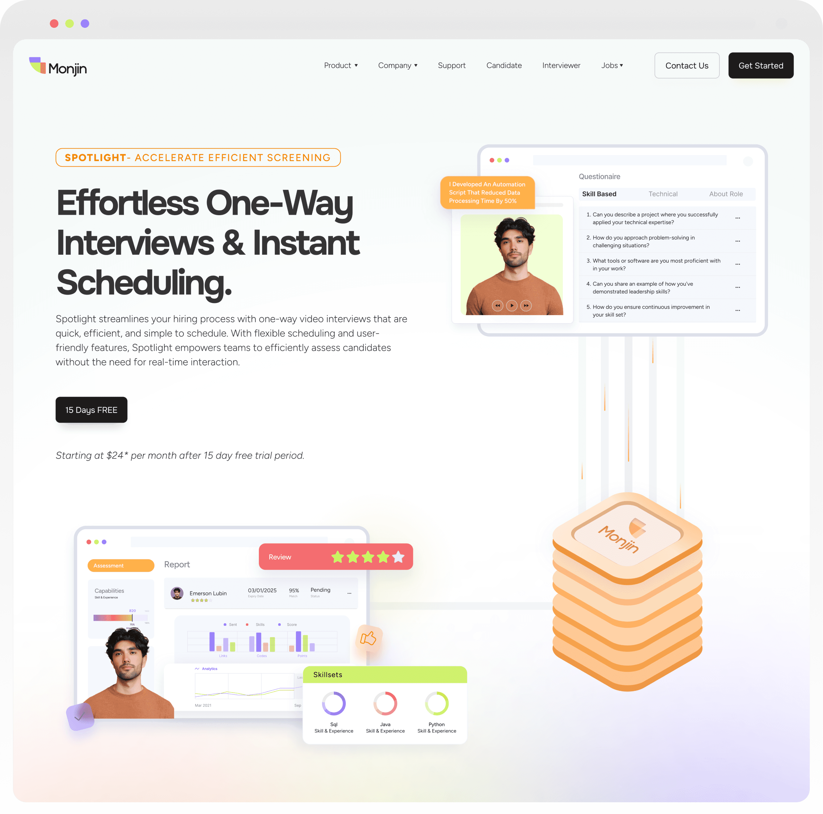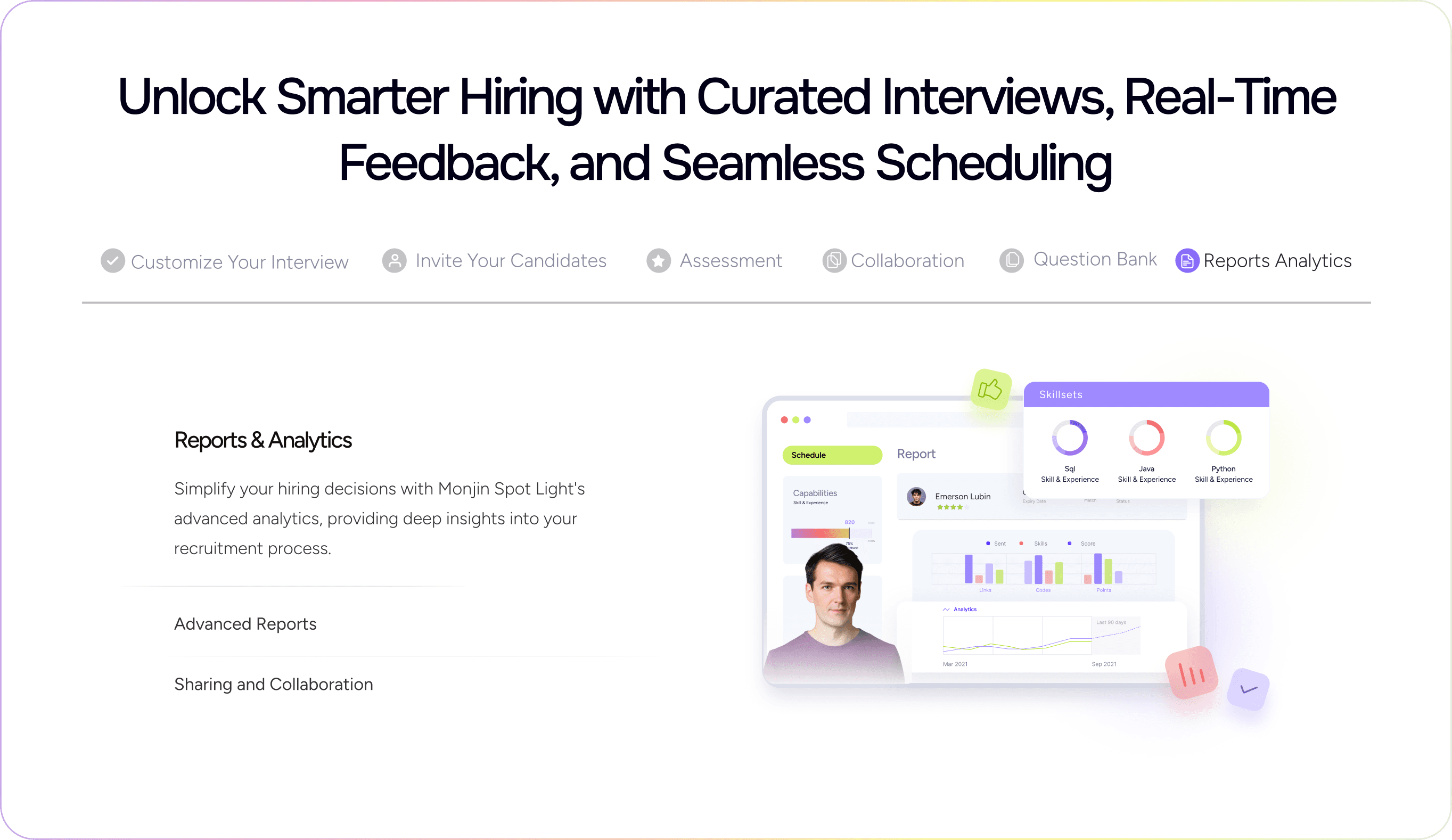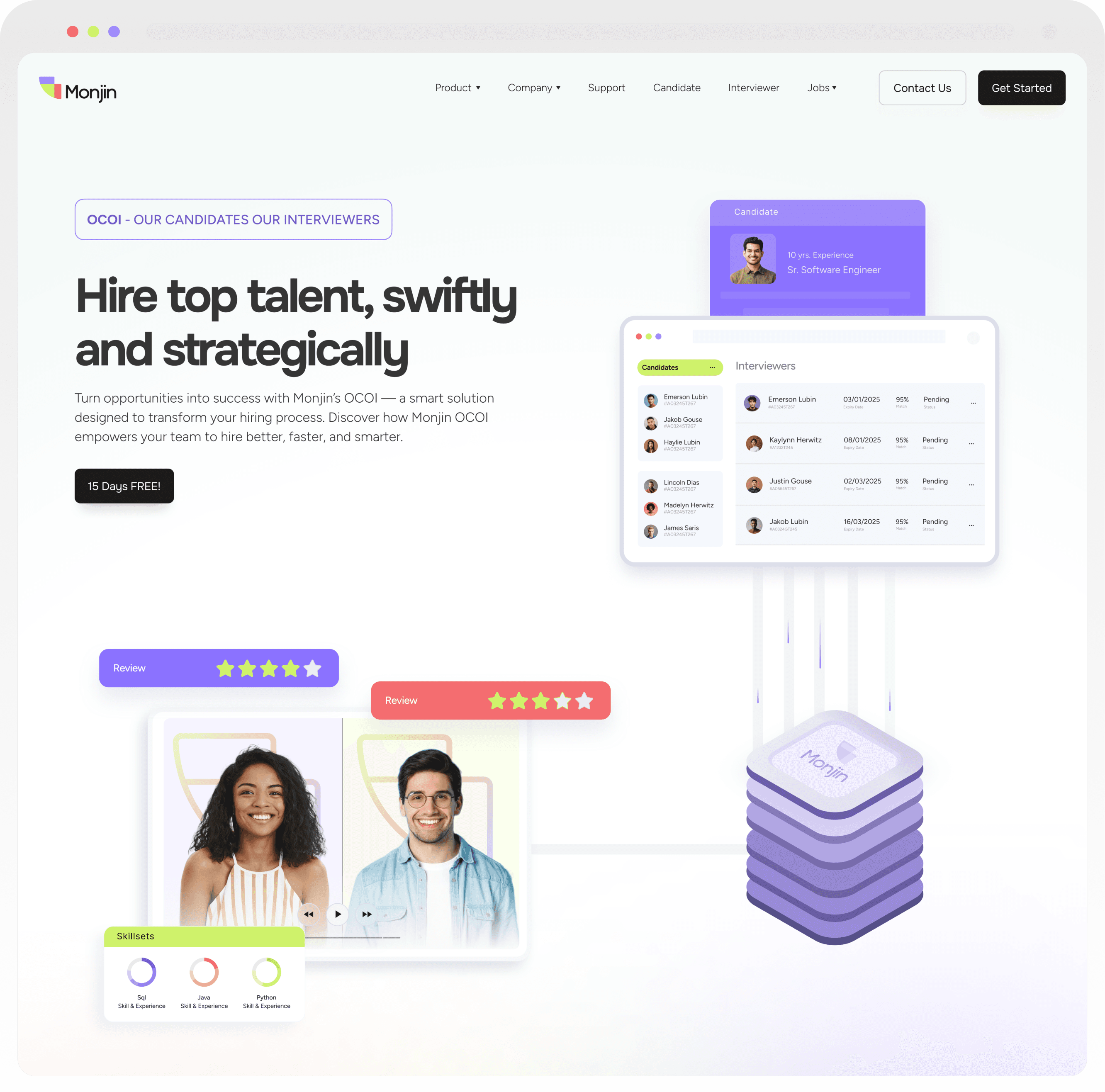 The typography is clean, crisp, and minimal to reflect Monjin’s modern identity. The color palette is diverse to mirror the range of products, with three primary colors representing the brand’s key audiences employers, interviewers and candidates.