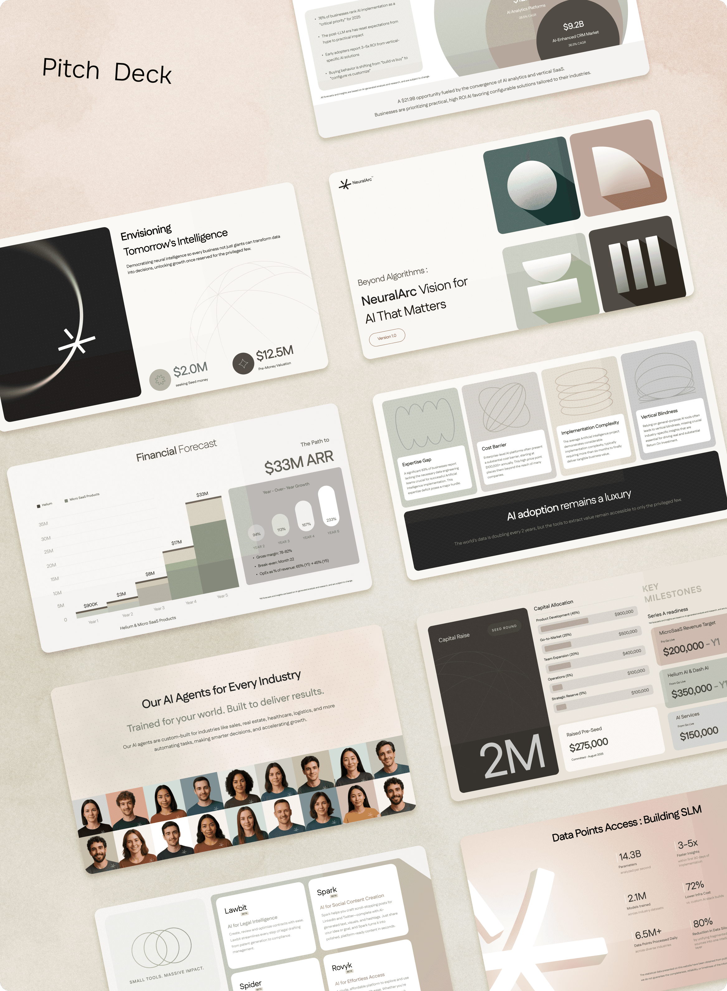 NeuralArc’s typography is modern and minimal, reflecting clarity and trust. Paired with a muted earthy pastel palette, it creates a calm yet distinctive identity that breaks away from the loud aesthetics of typical AI brands.