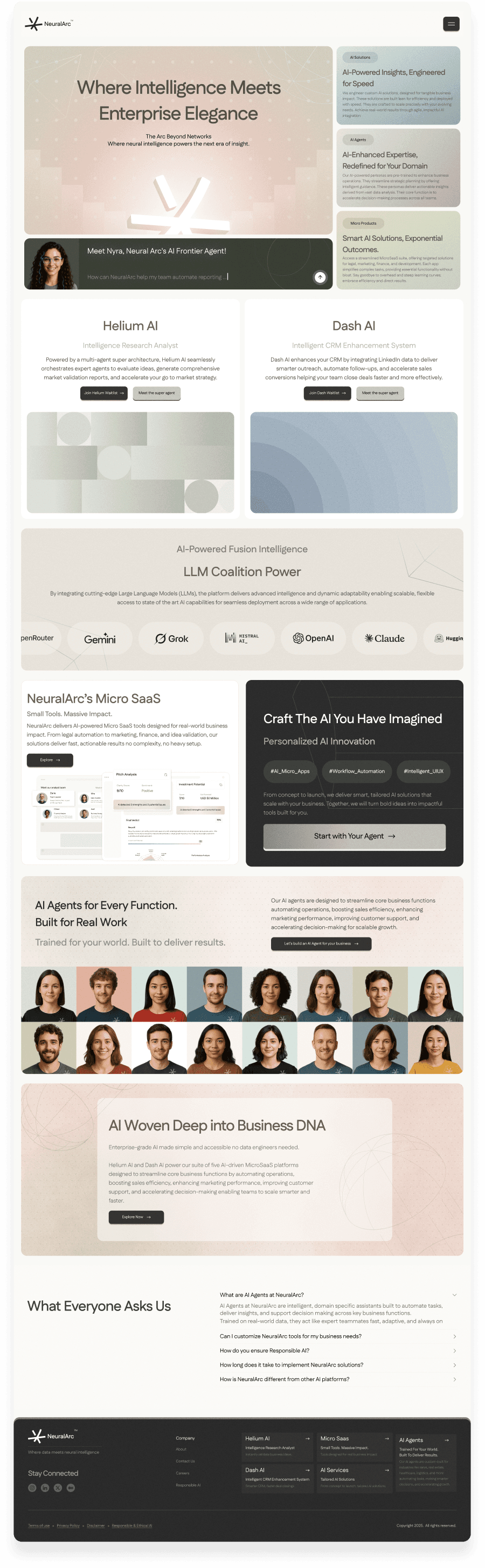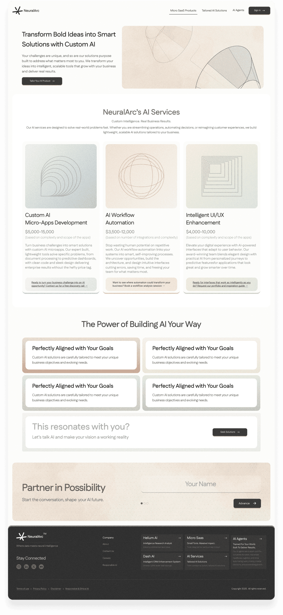 NeuralArc is an AI ecosystem offering marketing automation and microSaaS products through Neural Paths.