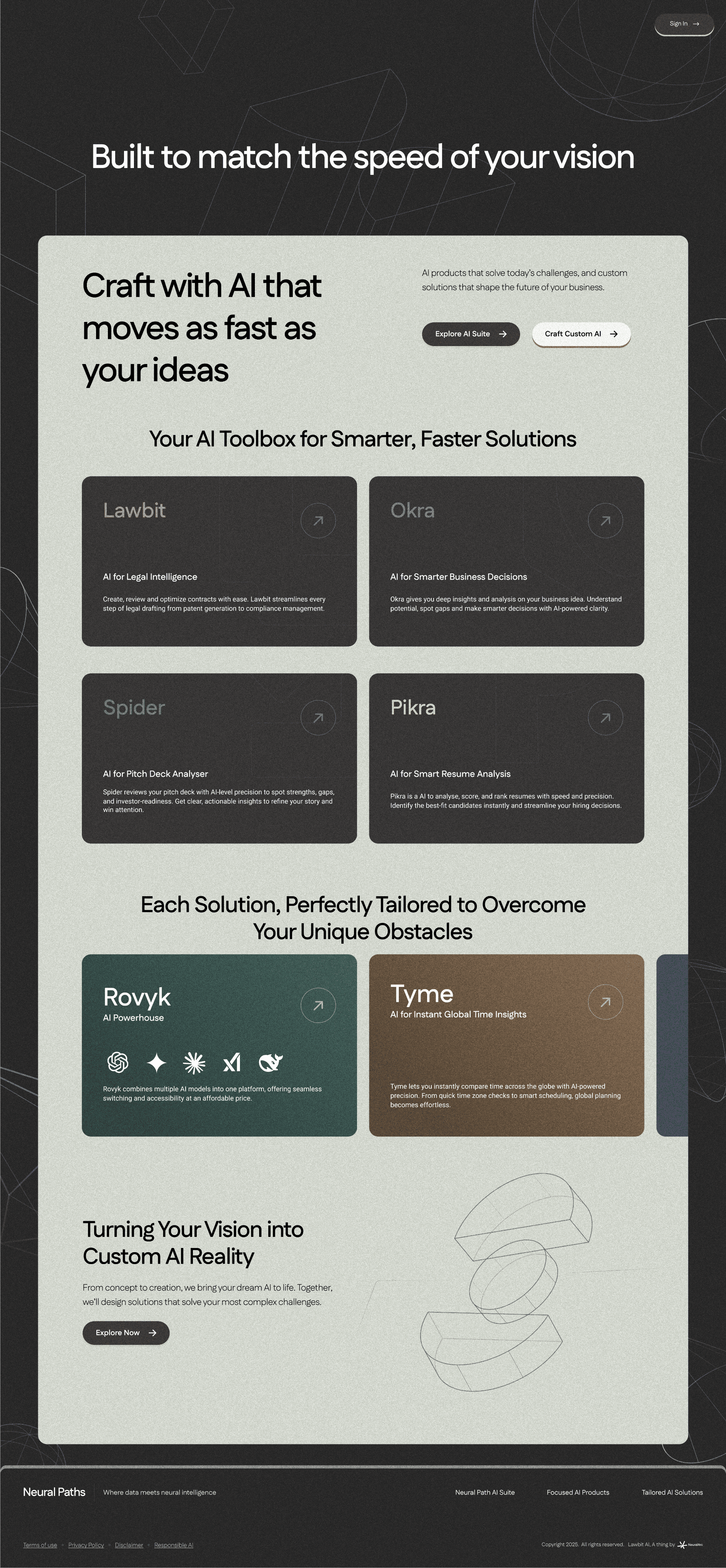 The project involved brand identity curation, brand collaterals, pitch deck design and website UI/UX design for both Neural Arc and Neural Paths. The challenge was to balance a futuristic, AI driven aesthetic with a calm, trustworthy and human centred design language that stands out in wide AI market.