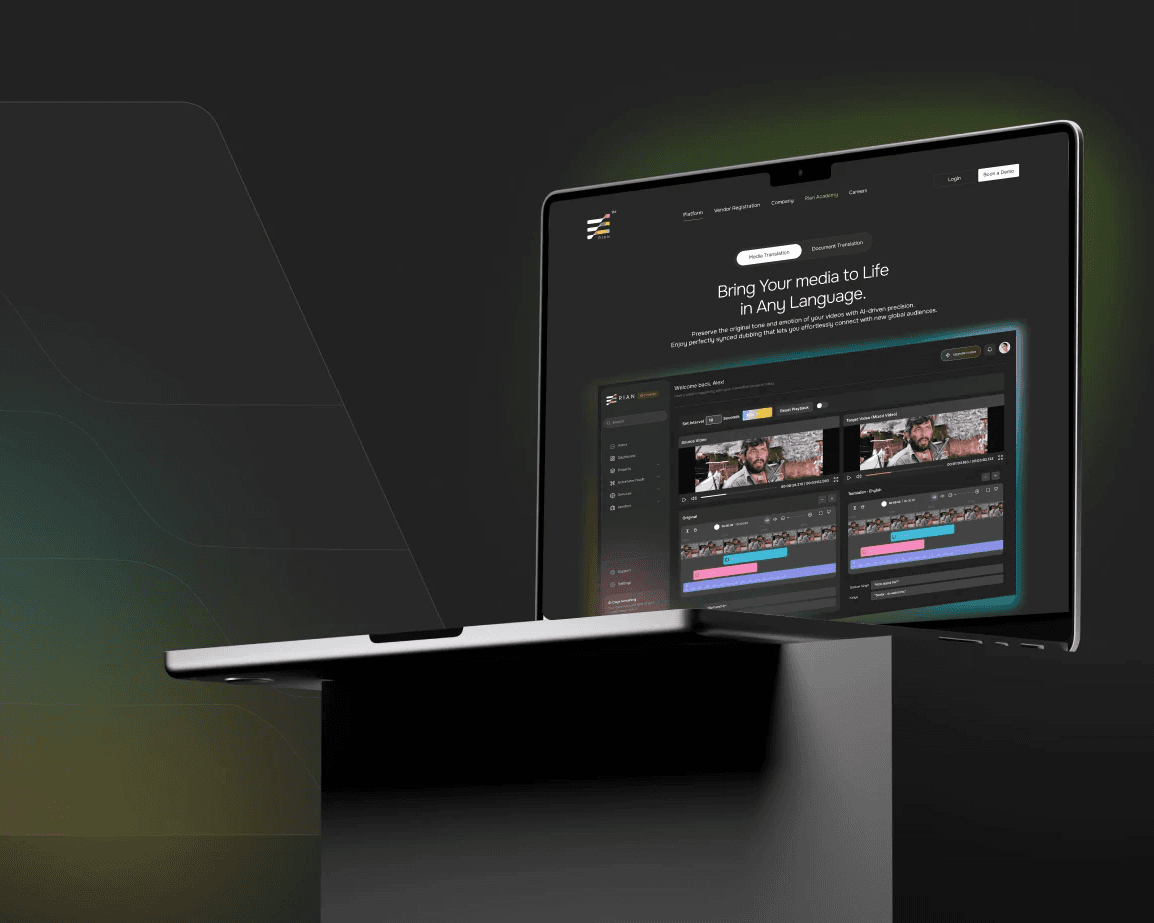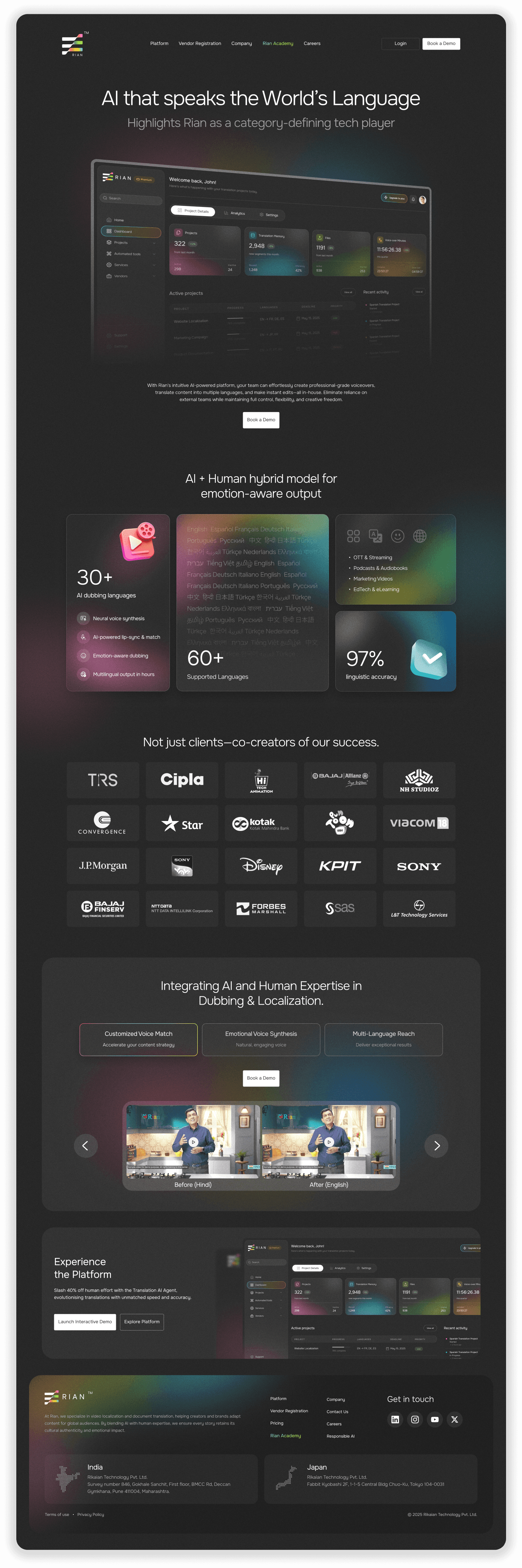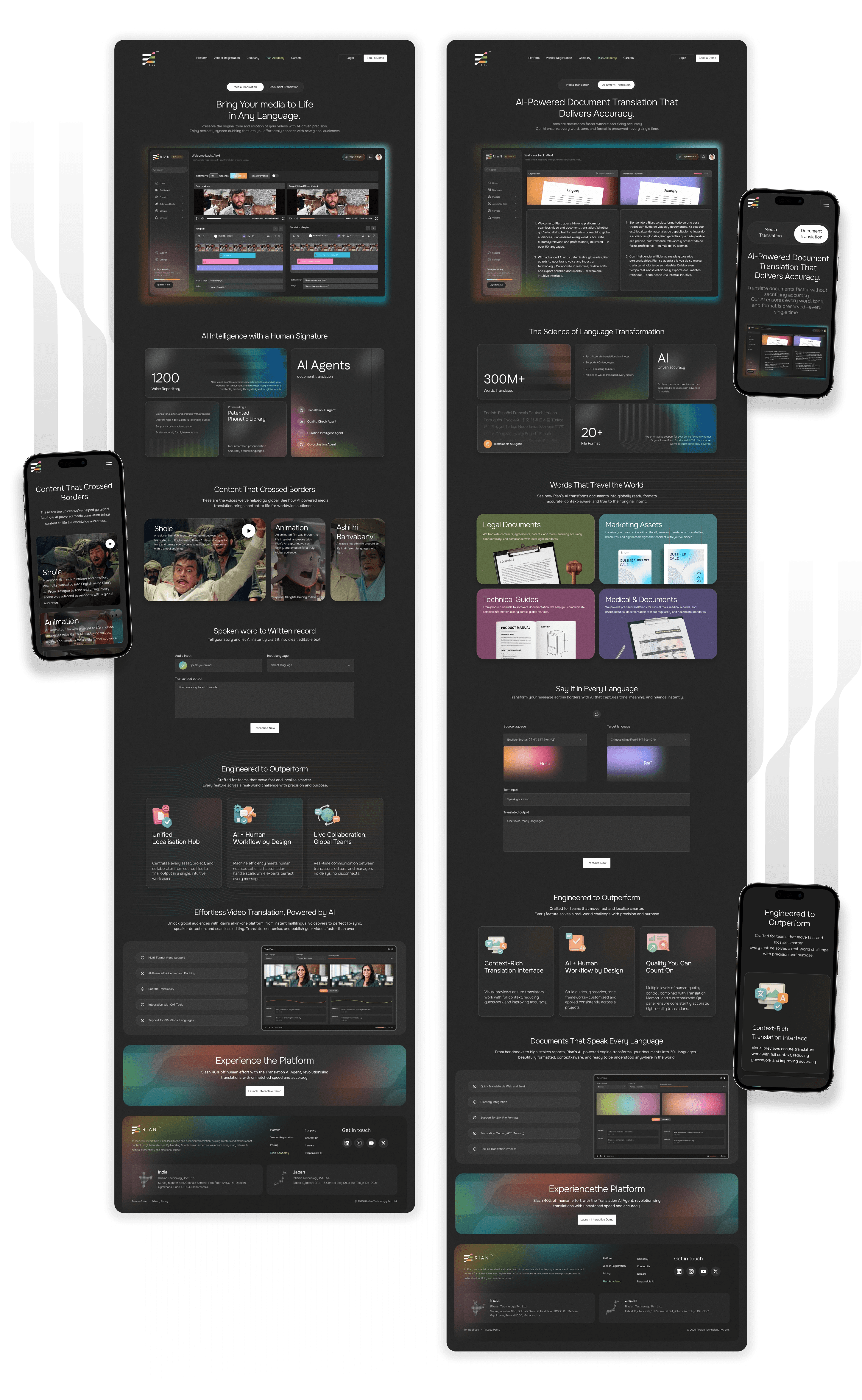Rian’s platform is at the core of its business, so it was essential to do it justice. The page highlights its two key services, Media Translation and Document Translation, through an interactive tab structure, making the platform easy to navigate and intuitive for users to explore.